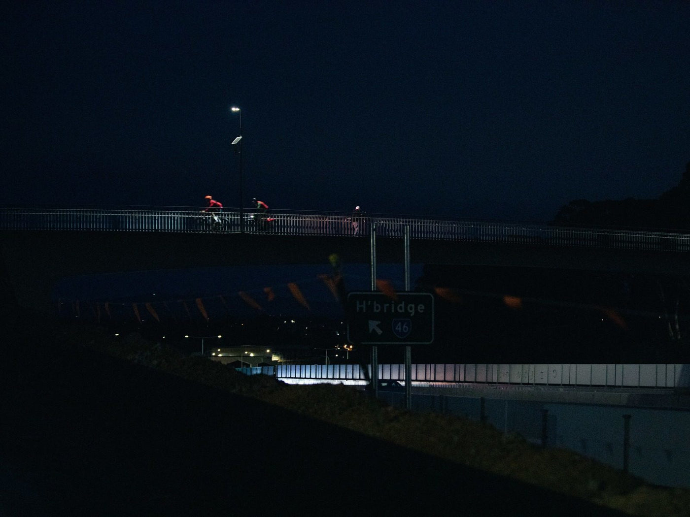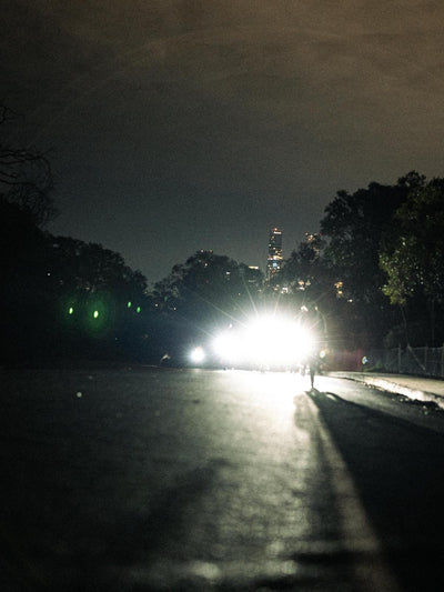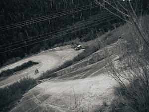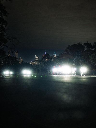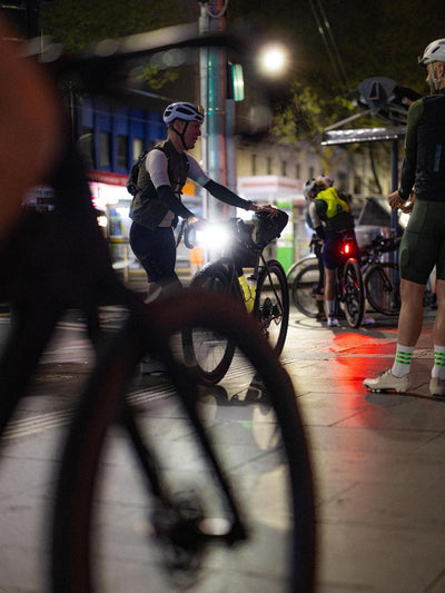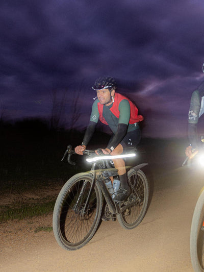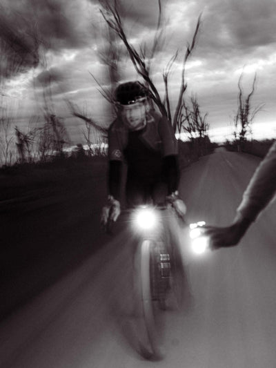 The riders split. Some of them choose the safety and warmth of the motel, full of pub grub and recovery beer in hand. Only the brave continue on into the night. Into the darkness. Guided by small streaks of gravel illuminated in front of them.