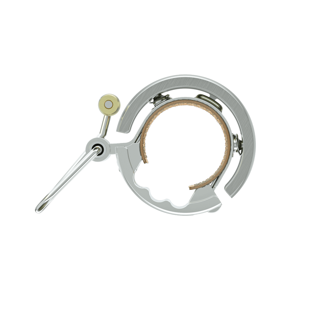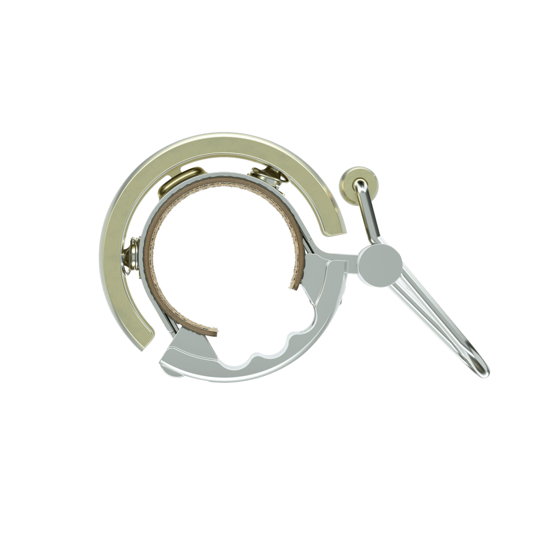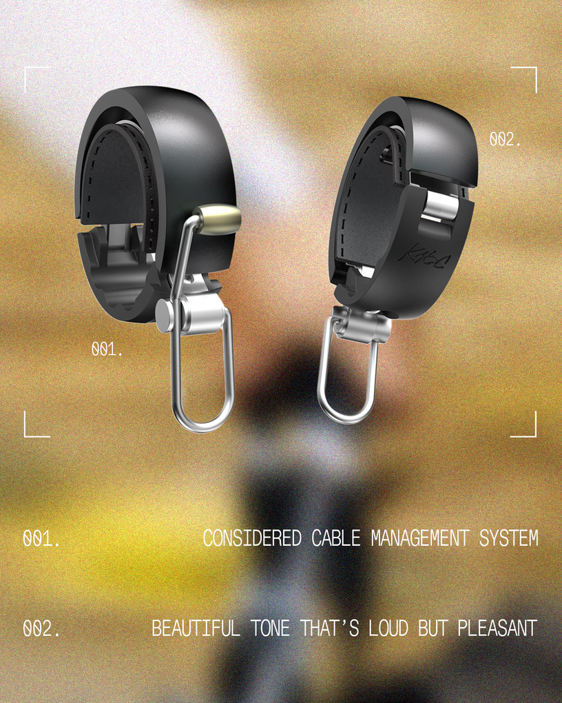 Oi Luxe features a CNC machined ringer, brass dinger, stitched vegan ‘leather’ shim and metal injection molded stainless steel. It's made to last and is a joy to have on your handlebar.