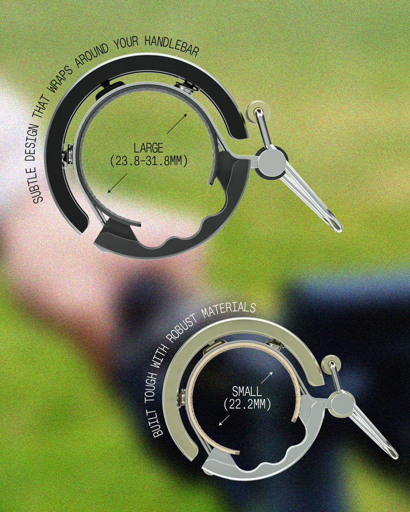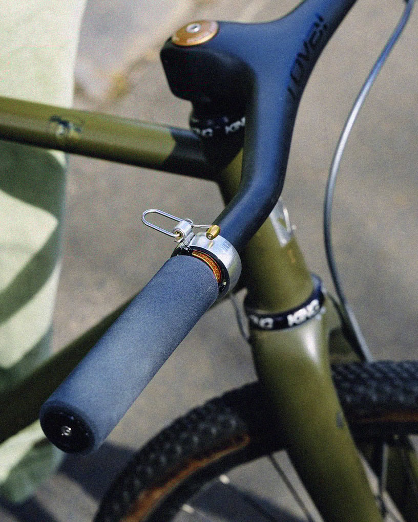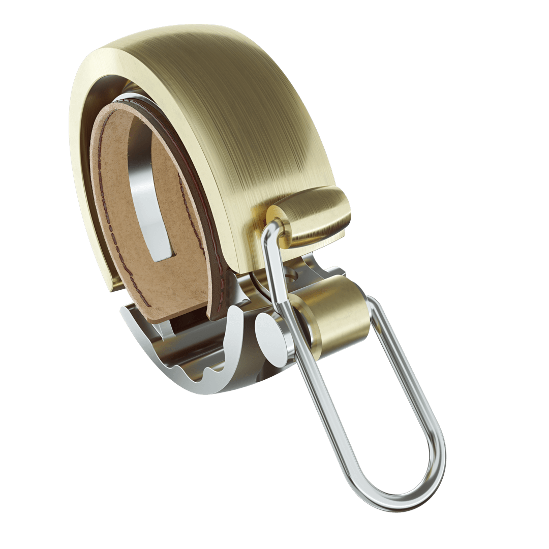 Oi Luxe features a CNC machined ringer, brass dinger, stitched vegan ‘leather’ shim and metal injection molded stainless steel. It's made to last and is a joy to have on your handlebar.