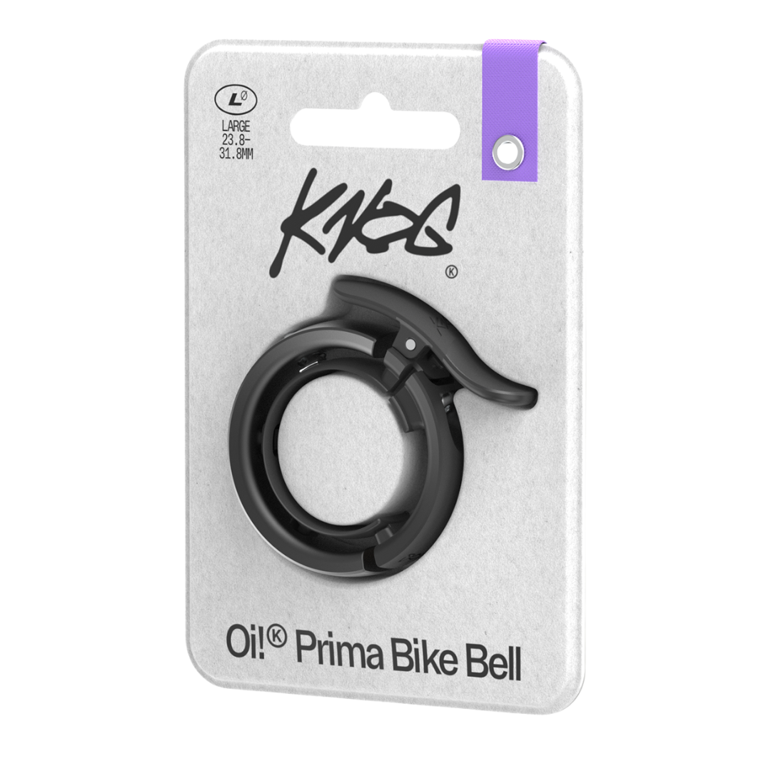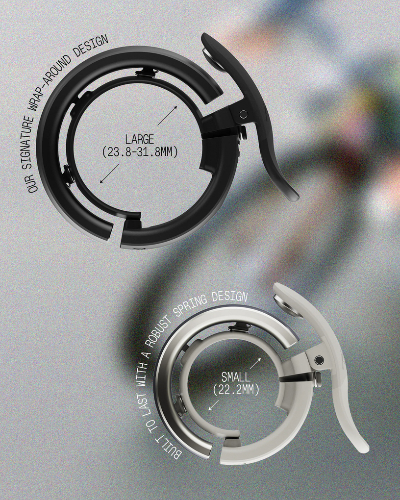 Oi Prima bike bell features our signature wrap-around bell design and our newest innovation - WAVETEK hammer technology. The whip of this new hammer design helps to create a beautiful and consistent bell tone, while being built for robust and long-lasting use. Available in two sizes to ensure the correct fit on your handlebar (see our size guide for info on how to measure your bar diameter).