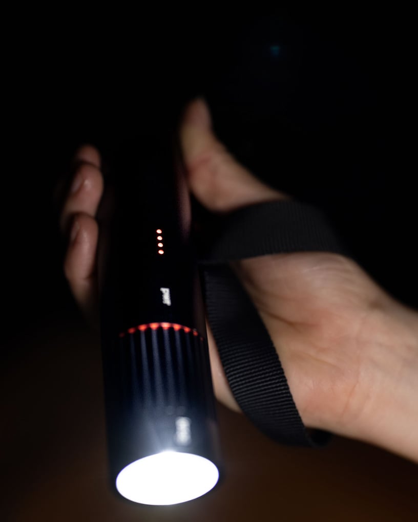 It comes programmed with five light modes, a strong nylon strap for secure use on-the-go, and can also be used as a PWR bank (medium) for charging USB devices.