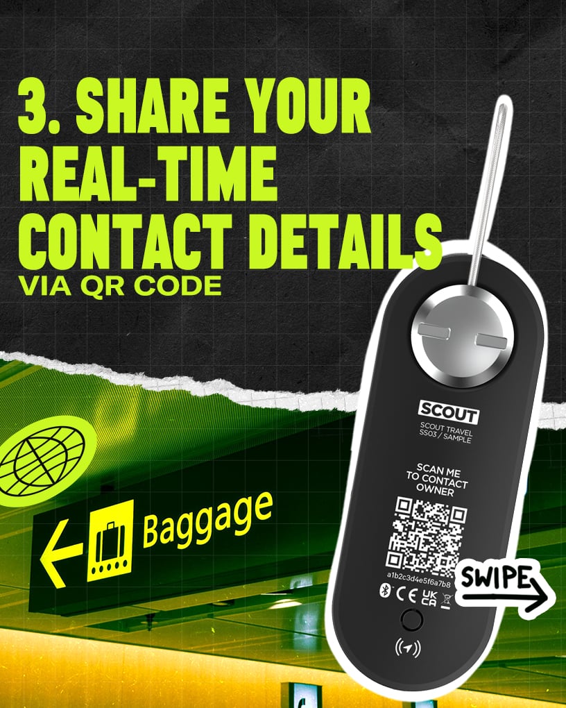 Digital ID - The contact information you choose to share in real-time (via the app) can be easily accessed by scanning the unique QR code printed on Scout Travel.